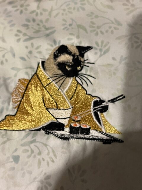 I love how Judy used Metallic Thread for her cat!  It really stands out  as a luxury design.  Forgive me Judy for posting both photos!  The one with the shadow really shows the sparkle of the metallic thread. 🙂