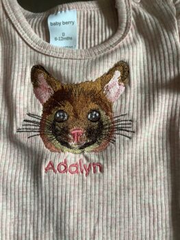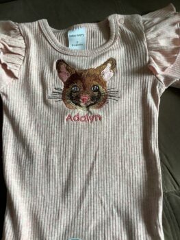I’ve attached a couple of pictures of the possum stitched out.  I took a big risk and reduced it by 25% (normally I would never do this , but I just couldn’t hoop it my larger hoop due to the size of the onesie). I was hoping that your digitizing skills would prevail …and they did!  I’m very happy with the result.  The only potential issue I had was when stitching out the whiskers I had a few breakages, no doubt due to me reducing the design so much.