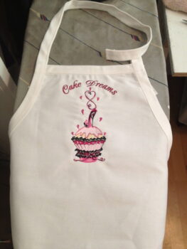 I don’t know if you remember, but when you first released the Sally King cupcake set, I had sent you an email about the promotion you had going on at the time. Well, I did get the apron made for the lady who made the top tiers of my daughter’s wedding cake and the wedding was today. The top tiers of the cake were traditional cake but we made cupcakes for the rest of the cake… so your design set was perfect. The lady who made the top part of the cake is trying to open her own cake decorating business and she did a beautiful job (and didn’t charge hardly anything! She’s a friend of a friend, but still…). Obviously I added the text, Cake Dreams is the name of the business she’s opening. Anyhow, she loved the apron and the design was absolutely perfect. I’ve attached the picture of the apron onto here for you, in case you want to use it for advertising purposes or as a project picture.