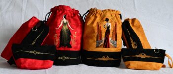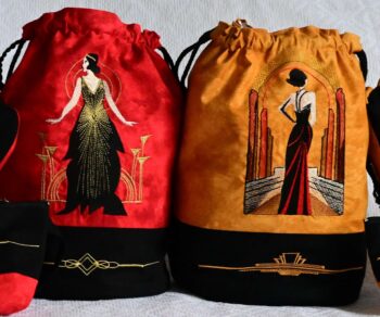 Cosmetic bag sets: a bucket bag with a complimentary pouch and east/west bag. I used a vector graphic to create the Art Deco border so that I could match up the 3 pieces into a set.