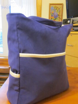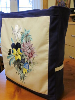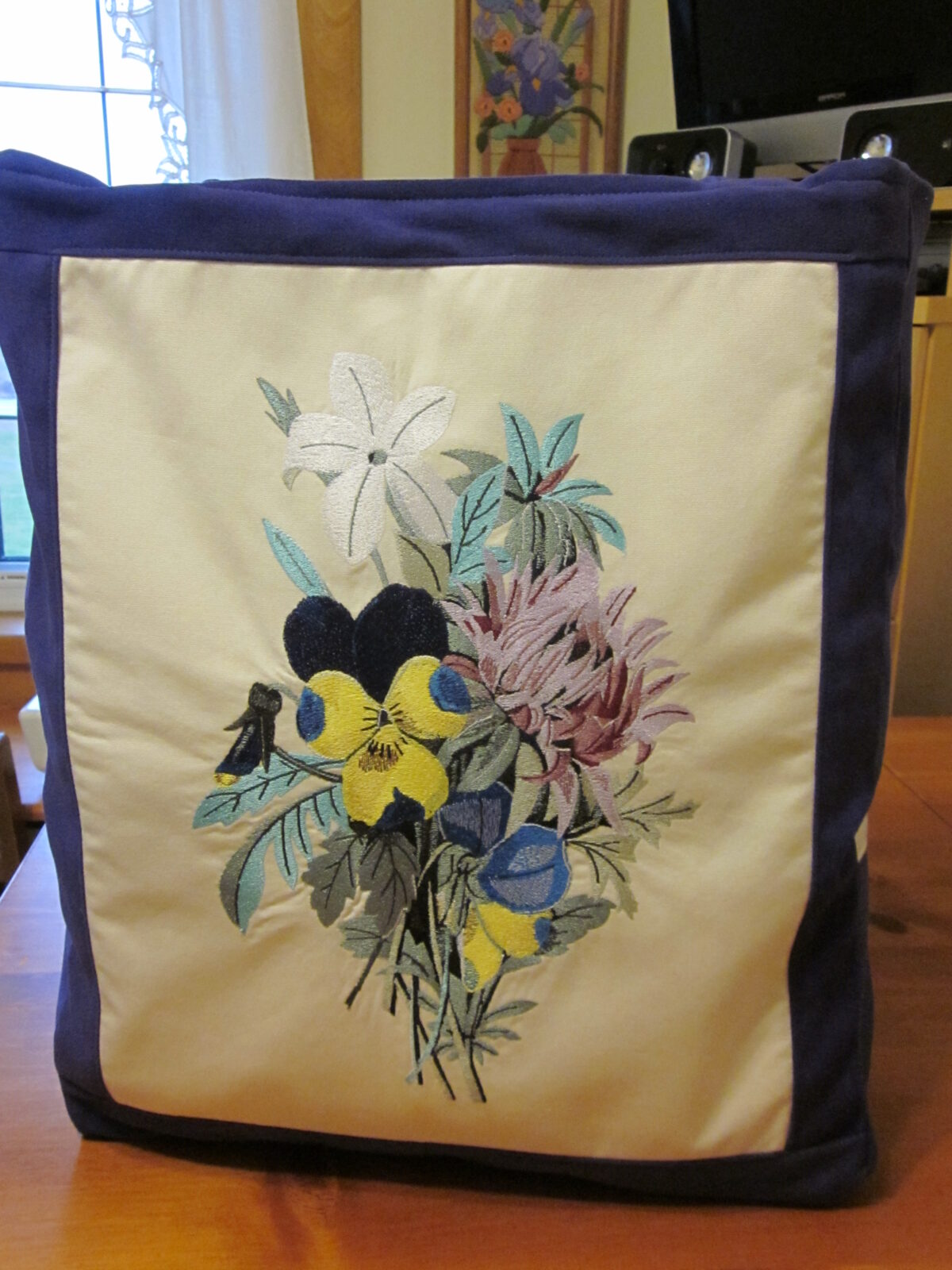 I used the Spring Bouquet Super Tote (BFC1165M) to make a knitting bag as a Christmas gift. The design was stitched on a cream linen and the bag is a purple faux suede. The tote lining and trims are also made from the cream linen.