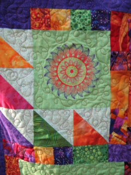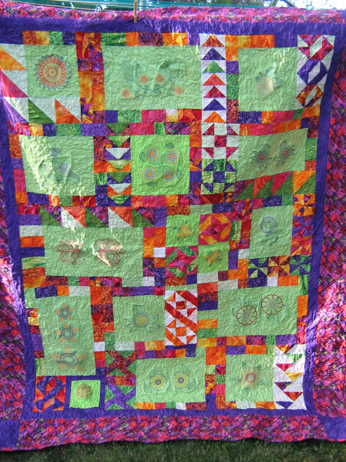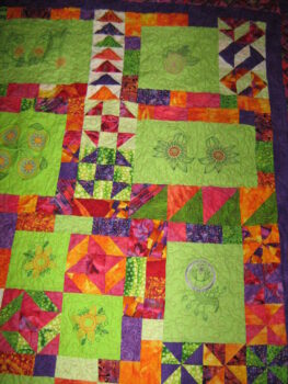 This quilt is made from Vickie’s quilt pattern and the designs from the 10,000 member set. It was so much fun to make since borrowed a friends embroidery machine and did the large size of the designs. As you can tell I love the bright colors. I started out with all the colors in a print I had and thought that would be the border but I should know better by now and never decide on a border until I am done as this one spoke to me instead.